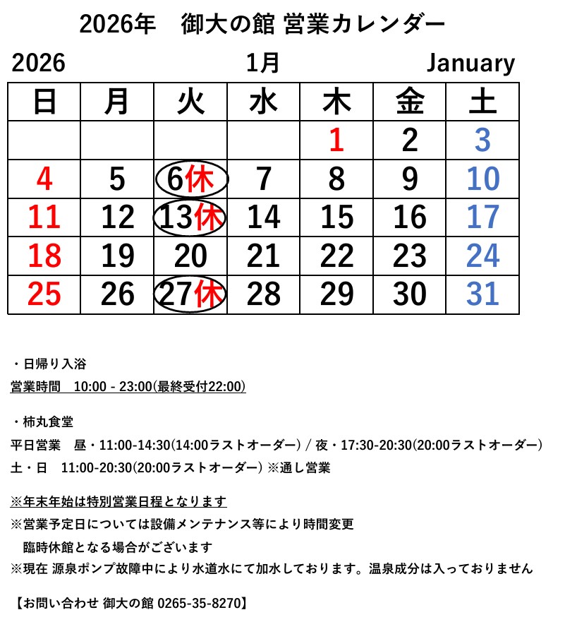 カテゴリーカテゴリー カテゴリーを選択 重要なお知らせ お知らせ イベント情報 観光情報 ブログ アーカイブ アーカイブ 月を選択 2025年12月 2025年11月 2025年10月 2025年9月 2025年8月 2025年7月 2025年6月 2025年5月 2025年4月 2025年3月 2025年2月 2025年1月 2024年11月 2024年10月 2024年9月 2024年7月 2024年3月 2024年2月 2023年12月 2023年11月 2023年10月 2023年9月 2023年5月 2023年4月 2022年10月 2022年8月 2022年6月 2022年5月 2022年4月 2022年3月 2022年1月 2021年12月 2021年9月 2021年8月 2021年7月 2021年6月 2025.12.29 重要なお知らせ 2026年_1月営業カレンダー 年始は1月1日(木)12時より営業いたします。 一覧へ戻る